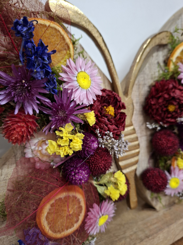 Inhoud pakket: Vlinder (40x30x7,5 cm), verschillende droogbloemen en materialen en een beschrijving met een stappenplan.