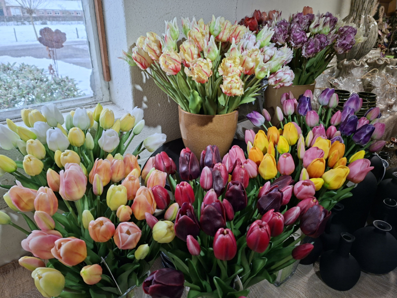 Een bos van 7 mooie 'real touch' tulpen in verschillende tinten (4 open bloemen, 3 in knop). De lengte van deze tulpen is 40 cm.